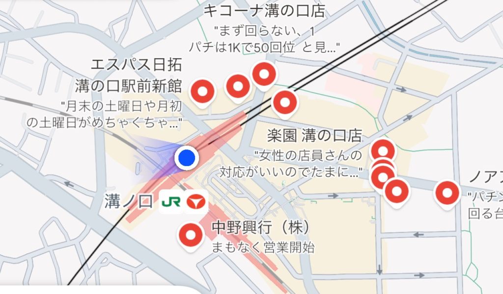 溝ノ口駅周辺には、大中小のパチンコ店が軒を連ねています。