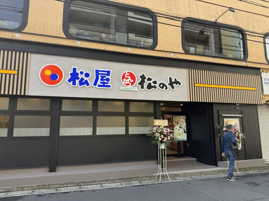工事が始まったときから「何かできるのかな?」と気にしていたのだけど、少しずつ外装が整っていく中で、看板に「松屋」と一緒に「松のや」の文字が現れたときは、「あ、これは合体店舗だな」とすぐにピンときた。